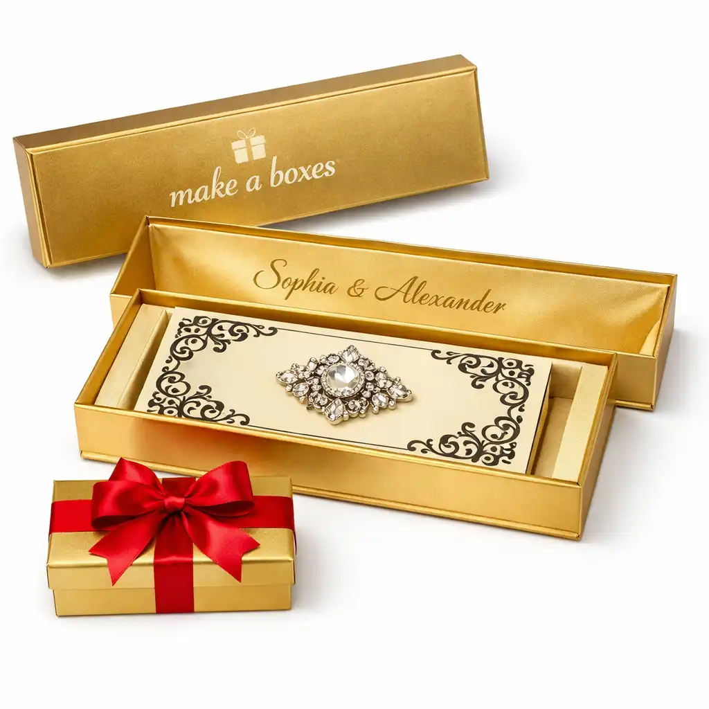 Create memorable invitations with our personalized wedding card boxes and printed wedding card boxes, made to hold full invitation suites like main card, RSVP, details, map, envelopes, and extras.